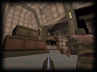 "You only had time for a candy bar before being called up and stuck in amongst a heap of crates. Your backside is numb from the jolting ride, your stomach is complaining, and your standard issue flashlight barely illuminates your orders. According to what you've read, your destination is scenic Frater Base, where they're - *rehabilitating Quake goons!?* ... The engine tone changes subtly; the drone's starting to land. You sigh, then methodically load your gun. Your anger still burns, but you're resigned to your fate. May as well take it out on the baddies." ~ Robert Cruickshank Sporting the fantastic Iikka Keränen texture wad Robert Cruickshank has created level that demands exploration. Starting in a cavernous crate loading area you are quickly faced with an intense firefight as you struggle to determine the location of your attackers. Fighting them off you quickly make your way into a central tunnel area, and from here you must use your wits to gather the necessary keys, battle fierce guards, shamblers, vores, knights, and scrags to progress to the tension filled final end sequence. Gameplay is tough. Health and ammo are in short supply and without careful conservation you will be attempting to fight heavily armed foes with an axe, which I was forced to do for a moment or two! Of particular note is the battle for the gold key, as well as several other battles which find you hitting switches and then facing multiple foes. Architecture is a joy, and the scale is perfect for the premise and task at hand. Even though you will face overwhelming numbers and foes often, you will find plenty of cover to use at your advantage to help even the score. Robert Cruickshank