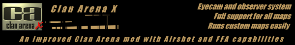 ![]() Download: Clan Arena X is an actively maintained and developed mod released in May 2006. Suggestions, comments, features requests and feedback are welcomed. Post at QuakeOne forums or private message R00k or Bam. |