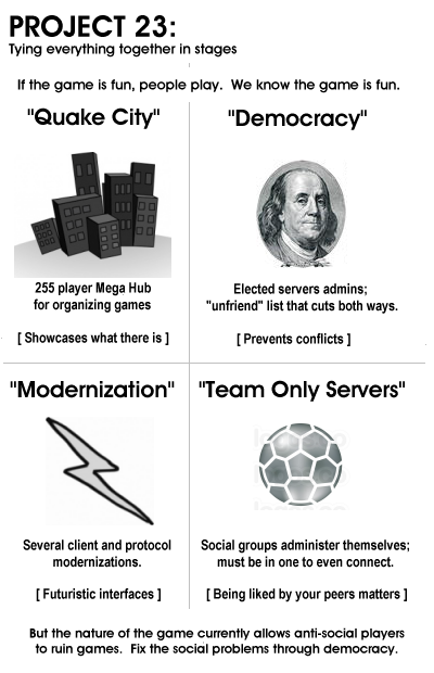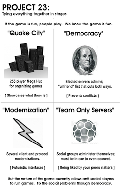 If you've seen the Undergate, the Rocket Arena Gateway or played RQuake or ever experienced Gunter's Hub back a few years ago, you likely have a good idea of #1. If you've seen some of the screenshots I've posted at Inside3D or a couple here, you likely know where #3 is going. Unlike free-for-all games, team games like Capture The Flag or Team Deathmatch are exceptionally vulnerable to anti-social behavior: which is what #4 looks to fix.