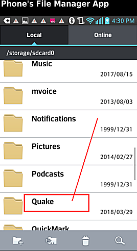 2. VIEWING QUAKE FOLDER LOCATION ON PHONE