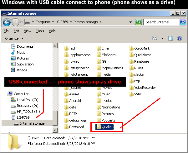 1. VIEWING QUAKE FOLDER LOCATION ON WINDOWS PC WITH USB CORD TO PHONE
