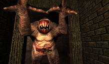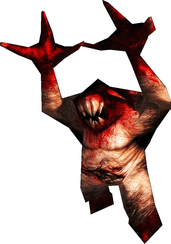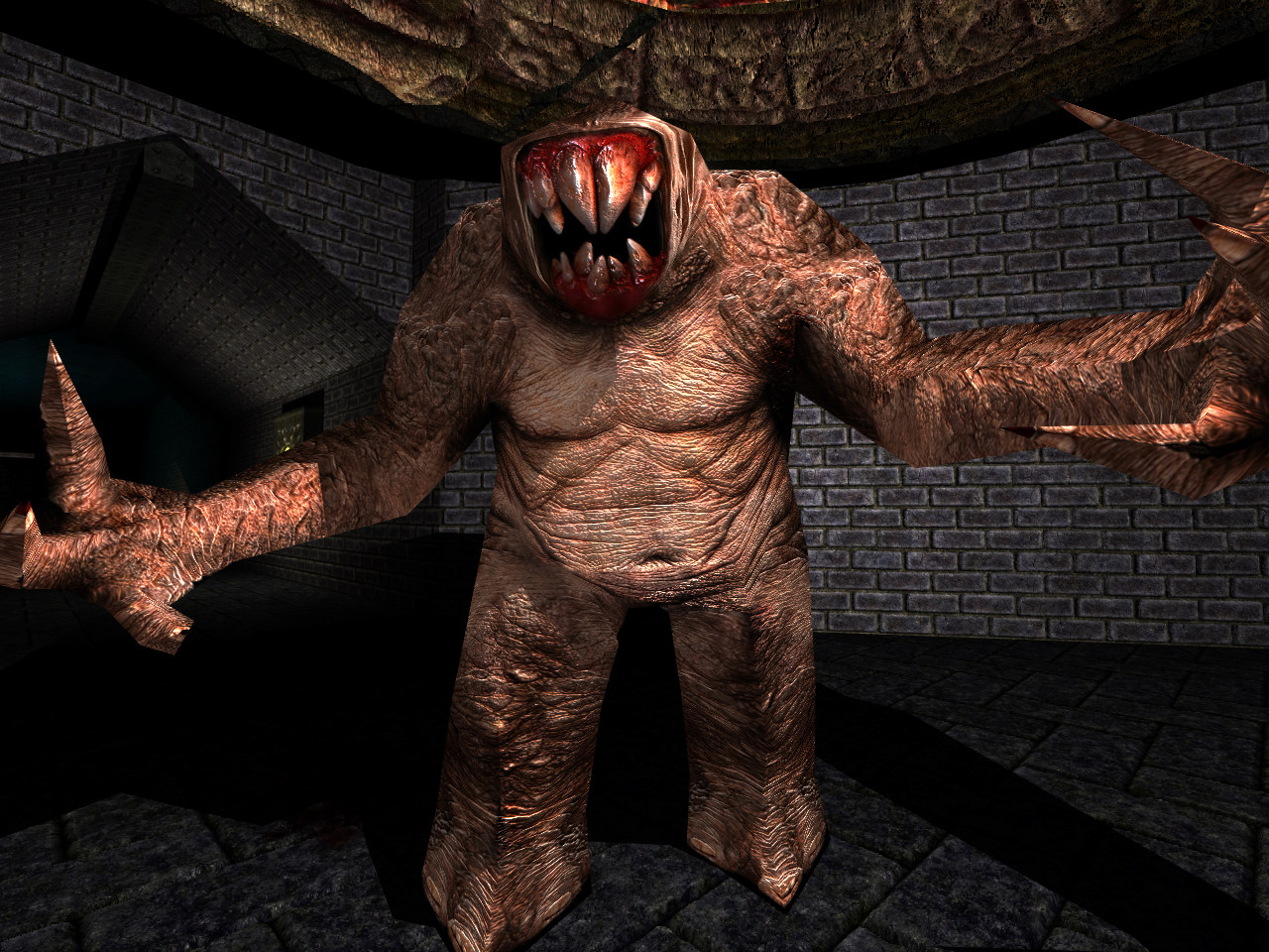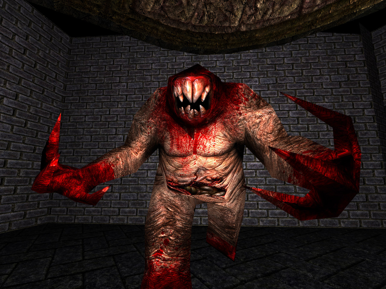 In Quake 1, a Shambler is a Yeti-like large beast with blood-stained white fur, a very large mouth displaying enormous fangs, no visible eyes, and sharp claws. Its furious melee claw smash does enormous damage, and at a distance, it can attack by projecting a bolt of