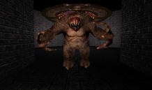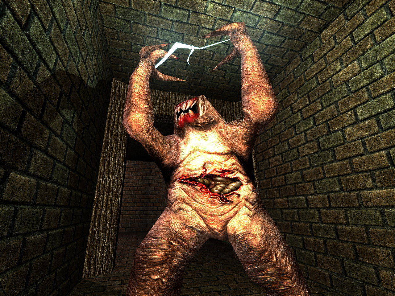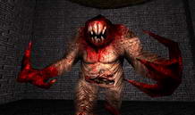 Shamblers are truly a force to be feared. They have an immense amount of health, and take only half damage from explosions. His pride and joy is his lightning attack, and for good reason: it never misses! Unless you can duck behind cover or retreat beyond the range of the attack, you'll be hit for considerable damage. However, the Shambler's weakness could be his proclivity to use his bare hands when he can. As long as you're within melee range, he will eschew his ranged attack for a good claw swipe or two. So if cover is not available or you're feeling particularly daring, you can run up and initiate his melee attack, then quickly step back to fire shots at him while he is swinging his arms through the air in which you stood a moment before. Then, run back forward before he begins another attack, or he will choose the lightning bolt. Repeat until one of you is dead.