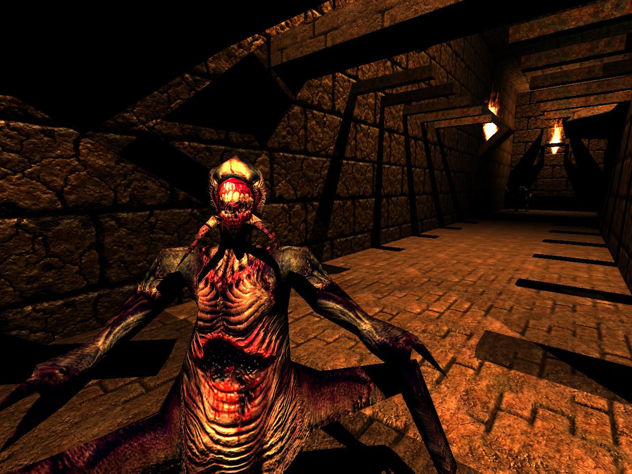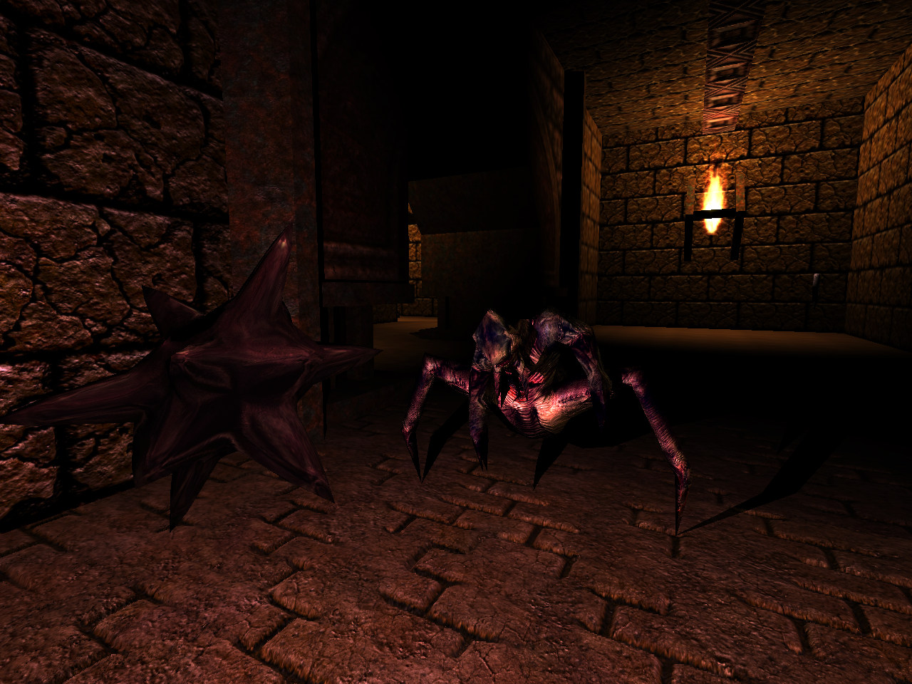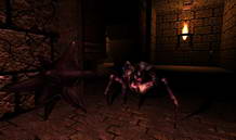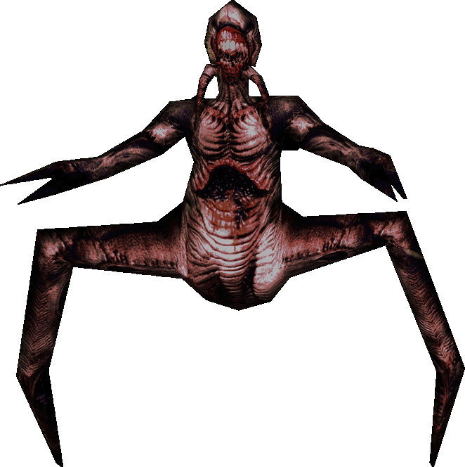 In Quake 1, a Vore is an anthropomorphic spider-like creatue with three legs, two arms and a head with a huge, lipless mouth of many teeth, framed by two pincer-like appendages. It generates exploding, violet spiked pods that home in on you. These balls cause major damage and will constantly chase you until they hit something.