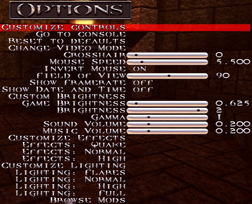 Settings optimizations World Textures (Quake & Exp) Skins (Monsters & Models) Models Sound & Music Best Mods |
