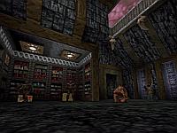 This map also is done in blue theme, but using the blue Dissolution of Eternity rock texture, and wooden and metal supports. Visual interest is achieved via subtle angles to rocks, most of the rocks having support beams running everywhere, bookcases and curving corners. This look is visually appealing at first, but gets old rather quickly. Game play is even more frantic this time around, some parts too much so, in particular the beginning. Ammo and health are as always spot on. The ending is pure pandemonium, using the wizard creatures, a worthy climax.
