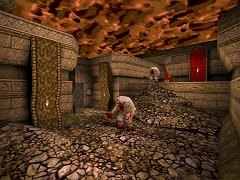 ![]() (Size: 1.05 meg. Above link includes mirror downloads.) ![]() ![]() Like Alk05, this level relies on a strong, original, consistent style for visual effect, rather than any diverse or spectacular designs. The theme is an Egyptian palace, at least in the textures and details: Sandstone walls, gold buttresses, and rich red buttresses with torches set in. Some pale green textures give it a curiously mildewed look, while occasional hi-tech-ish doors look out of place. Designs are quite simple, the map is based around a two storey selection of sometimes basic rooms and corridors. The most impressive architecture is in the larger outdoor rooms, the smaller in-between sections are stylish, but repetitive. However there's a great use of angles throughout, and the build quality is consistently good. The level needed more diversity in designs - temple fronts, more 3D sections, use of water, for example. It's a bit like a custom DM level in that the eye-candy comes from good texturing and details rather than structures, but being SP, more impressive structures could have been used. Progression round the map is good, as there is some non-linearity and a clear choice of routes through some sections. With the distribution of weapons, all paths are balanced. Secrets are simple though. Like the design, the gameplay's main strength - and weakness - is it's consistency: Combat is steady and unrelenting through all areas, with plenty of monsters (including Snakemen), all sections well used for fighting, and plenty of teleporting monsters appearing to keep the combat flowing even when backtracking. But it's not overwhelming as the map design makes it easy to channel monsters to where you want them: I.e. backing away from monsters shooting, or just ducking behind the nearest corner if they dare fire at you. It continues like that throughout the level, and provides a war of attrition rather than any especially challenging combats - the finish, against a toughened Deathknight, is easy to escape from. Items are in good supply, tending towards ammo more than health, and with the secrets the balance is very good. However the combats can be too similar, and the only slightly effective skills settings might make it too hard for some players. - - - - - - ![]() |