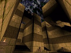 ![]() (Size: 1.1 meg. Alternative downloads: Dazsp2) ![]() ![]() Another temple style level, another very distinct execution of this theme. The main architecture is dark, atmospheric, deserted "city" courtyards, with tall, squarish (though slightly rounded off) "buildings", walkways, passages and arched windows. This is textured in clean sandstone with wooden banding, giving a strong style which shows how good simple but dramatic designs can look. Since it's a Daz map, naturally there are some diverse design styles mixed in: a sort of temple bunker style, angled corridors, rock sections, and various other designs in the temple style but quite different to the rest of the map. Textures mostly work well, with nice details, but sometimes are too plain (though this is fine on the buildings), sometimes the combinations are a bit too busy. With the gloomy night-time setting contrasting with strong torchlights, and little touches like piles of windswept sand and broken tiles, this map has a great, eerie atmosphere. It would have been better sticking to fewer styles and exploiting them more - especially the main, original city style, and enhancing the atmosphere with more broken sections and ambient sounds too. Still a cool map though. The lack of exploration - and any secrets - is disappointing given the map's design. The map feels like it should have more obscure places tucked away to discover. Gameplay feels exploratory though, not through route choices, but through the style of the map and the initially sparse combat. Very few monsters at first and it seems too easy, but definitely gets trickier later on, with some surprises. Monsters are a bit sparse but the challenge comes from the way they are used and having to take care with health and ammo. Monsters tend to lie in wait, and when they *lurk* in shadows it's a great touch. Ammo is rather tight, doesn't seem so at first but the later on it might - first time I played, I had to run past the final monster as I'd missed some supplies earlier on, doh. So it's best to be careful. The combat fits the desolate feel, it could have been enhanced with more monsters lurking in obscure places and a bit more ammo to compensate. The strong feel of the map stands out more than the gameplay, definitely worth getting for that. - - - - - - ![]() |