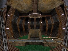 ![]() (Size: 3 meg. Alternative downloads: Gmsp1) ![]() ![]() A large, complex, futuristic base level, set on the moon, with a blend of sci-fi and industrial styles. It has a strong visual theme with lots of hi-tech, grey-tinged textures, grille details and pale blue strip lighting, all set beneath a starry sky. Further futuristic touches like computer consoles and complex locking doors leading into circular tunnels enhance this theme, while the highlights are perhaps the outdoor sections and caverns, with awesome base architecture built into the cold blue rock, and low gravity outdoors completing the lunar atmosphere. Architecture is very impressive throughout - aside from the outdoor areas, several large silos, supported by huge beams, are spectacular. Elsewhere, curves - including circular arches complete with curved lights - angles, and beams are liberally used to make all areas look good, and there are many great designs. Areas are complex and diverse in their overall design, and well interconnected. Aside from the occasional low gravity, custom force-fields, rotation, and exploding wall effects are used sparingly to provide more thematic interest, along with an unnerving warning siren. The map also features custom monsters, including nail, grenade, and rocket Grunts - used regularly but thankfully not too powerful, and giving more diverse gameplay. Also, a tougher Enforcer with a high quality blue skin that is more Borg than Quake, it's not as interesting to fight as the Mexx 10 nor Zerst�rer Enforcers. Finally, a new "droid" monster, which is a midsized, bipedal, laser bolt firing robot. This is reasonable to fight but again it looks very out of place in Quake's more arcane bestiary. The map's build quality is good too, but there might be a bug where you have to kill fish to open an underwater tunnel - if it doesn't open, a fish is missing and you'll have to noclip past. The complex layout gives a fair bit of exploration in some areas, as well 4 secrets, well worth finding including a particularly funky yellow armour. Gameplay, sadly, is not nearly as good as the design. Eschewing the recent trend towards very fair gameplay, it's more reminiscent of the excesses of Nehahra (perhaps due to improved Grunt/Enforcer AI). While some the combats are reasonable though still challenging, in other situations, lots of multi-directional attacks and fighting above slime can really wear down the already limited health and make the combats very hard to survive first time - more tweaking was needed. However, skill settings are effective, lower skills might be a good choice. Later on better supplies and armour make the level more fun, include a huge, more appropriately challenging finale - a sustained arena combat in an dramatic underground cavern. A level that is most worthwhile for the superb design. - - - - - - ![]() |