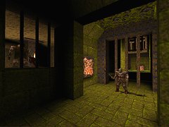 ![]() (Size: 990 k. Alternative downloads: Rumours) ![]() ![]() A largish level that covers a variety of Quake's medieval themes, from beige brick through rusty metal to green and slimey. Though it's all medieval, the different themes make it a bit incoherent. A small industrial base area, however, does work quite well in a covert way, and the lighting and sounds give it a fairly good atmosphere. Architecture is similarly diverse, with a few obvious setpieces having the best architecture, like a stylish, detailed medieval hall and a couple of rooms with good metal beam designs. Other areas, though usually containing interesting details, are less impressive and lack strong designs. This is sometimes due to the small scale in those areas leaving less room for designs, but the difference between the setpiece areas and the other, plainer areas is too obvious. However, textures are fine, and there's good details spread throughout, in particular the cool, consistently used, torch holders. Some details like a spear rack and a water trough would be better in a more "realistic" level. There's plenty of good ideas in this level, and they sometimes leads to good designs, but needs more it coherence and better designs in the minor areas. The key / rune grabbing mission gives a large route choice through most of the map - both routes being completely seperate and well balanced, with one exception. If you choose the rune route first (i.e. through the water by the medieval hall), the ending climax occurs partway through the map. Also there are 3 useful and fairly straightforward secrets. Sometimes you'll need to hunt around to progress. Gameplay is quite pleasant if you're careful, and fairly tricky rather than outright challenging. There's plenty of monsters, but they aren't thrown at you in unsubtle gangs, instead monsters lurk and lure the player into close confines. The combination of a small scale - which may feel too cramped in places - and dark areas, makes this combat tricky. But, played with caution it is fun and fair, and more satisfactory than charging straight in. There are some well set-up traps and ambushes, though the "pit of a thousand spawn" may be frustrating if it's not avoided. The ending (assuming it occurs at the end), is a good finish, not overly challenging. All items are in good supply, spread throughout the map, and skill settings are very effective so all players can have a go. - - - - - - ![]() |