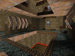 ![]() Aaahhh yes, Mr Jones, do come in, Doctor Enforcer is ready to see you now..... Hehe. Well, it's an unsual name for a map, and in general this map doesn't really adhere to any strong medical theme, apart from one rather amusing area that contains the gold key. This is a standard base map, with a few unusual touches, most noticably the use of lava, and in particular the use of the lava balls which are triggered to fly off to great heights, which gives a rather surreal feel. There are some nice architectural touches too, such as the rafter designs shown, the cool truncated circle doors, and a nice ledgey outdoor bit (not too keen on the square walls there though). It's always cool to see original touches like this, however, there are some dodgy architectural aspects: the corridors between areas are rather plain, some areas lack the attractive details (compare screenshots above), and most corridors are noticabley dark, even pitch black in places, which could be atmospheric, but I found it a little irritating with Grunts shooting from where you can't see them. Overall the map does have enough original ideas to keep your interest though, though it would have been better if all the map had been to the standard of the more detailed areas. Gameplay is as you might expect, in the decent and fun base style, mowing down plenty of Grunts with your double shotty. However, there is one big flaw, not to do with fighting, but under the gameplay criteria, and that is getting out of the first room, it requires you to shoot a switch which, while in clear and open view, has no real indication it is a switch (though it does actually appear as a proper switch after you activate it). Although this is not a serious problem (just hit everything is sight with the axe!), it's a bit careless and could prove frustrating. Once you are past this little obstacle, it's all fun, and the quantities of enemy and sparcity of health give it a nice challenge for a base map. There is also a useful Quad that is placed in a funky position requiring a thoughtful jump to reach, though unfortunately there are no other secrets. As is often the case, the gameplay could have been more climactic at the end, and the aforementioned "doctor" themed area had an obvious and cool idea that wasn't implemented. But overall, it's a fine, fun map. - - - - - - ![]() |