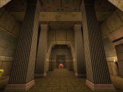 ![]() When I reviewed Tomb, I said that the temple style was "...one I had never seen in a decent SP map..." - doh!!! Time for me to eat my words, as aside from the Lost Island (to be reviewed at a later date), there is this temple masterpiece - how could I possibly forget it??? This is an claustrophobic Egyptian themed temple par excellence - it sticks to the theme perfectly. You know, I tried, I tried really hard to criticise the theme, the style, and the architecture of this map....but I couldn't. Yes the architecture could be improved: it could be more angled, and the small scale design could be made more spacious, but given what the level sets out to do, to create a templesque labyrinth, the style is pretty much flawless. The architecture is perfectly consistent throughout, yet the immaculately applied textures give variety, between sandstone, engravings, terracotta, and dark balsatic edifices There are plenty of details in almost all areas of the map, both design touches as pillars, subtle angles, braziers and sarcophagi, and in fantastic textural detailing - aside from the few plain connecting corridors, every room has something of visual interest. And what is more, it all fits together extremely well - a great example of adhering rigidly to a theme, yet exploring variety within that theme. However, aside from the beauty of it all, there is one distinctive design feature that may not be to everyone's taste: the map is designed on a noticabley small scale in most places - even the larger areas are, well, smaller, and the corridors are very narrow. Personally, I found this was not in the slightest bit detrimental to gameplay (even beneficial in some places), and indeed it added to the labyrinthine atmosphere. But if you are claustrophobic, you may find this rather cramped. Although you are generally forced in one direction as far as the layout goes, the style of the map gives a reasonable illusion of exploration, and there are a few secrets, though strangely balanced in places. Onto gameplay, and though this is a lot of fun, it doesn't quite live up to the high standard set by the design. The gameplay has it's own flavour, as the scenery precludes charging in and outmanouvering the monsters (which, needless to say, fit well with the theme). Rather, the design encourages a "shoot and duck" style of fighting, which is nice for a change, though less exciting than the normal Quake gameplay. As far as this style of fighting goes, the tight architecture does work against some monsters, making it easy to bottleneck them in doorways. In other places, they can surprise you in cramped places and be more effective, and there are a couple of good surprises. The main disappointment, after fun, well balanced and consistent gameplay throughout, is that the ending is just to easy. Although the ammo is well balanced up to this point, the prescence of the lightning gun and only one final monster makes it an anti-climax. Also worth mentioning - there are 2 death traps, one is indicated, which is fine, while the other isn't, which is not. These are not too detrimental though, and given the style of the level, I can recommend it pretty much unconditionally. (Size: 1.2 meg. Alternative downloads: Sadlark 9 / Sadlark 9)