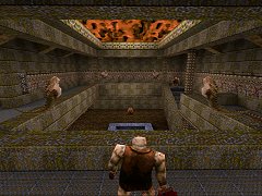 ![]() Dressed in a blend of terracotte and blue brick, and packed to the gunnels with 110 monsters, this is some citadel. A very meaty level, but will it spell your doom??? Nope, I don't think so, but it should provide a lot of fun. But before gameplay, architecture, and the architecture in this is a mixed bag. Some areas, such as the initial building front, are rather impressive, and some interior areas such as the girdered pool and the final room are equally nice. There are also some good details, like spiral stairs and the detailed windows, but in a few areas the architecture can be a bit bland and unpolished. There is also sometimes a clash between the terracotta style and the blue style - both of these are individually attractive themes, but don't always fit together. In short, the architecture is good and well made overall, but you're left with the feeling that a lot more attention was lavished on some areas than others. An attendant problem with 2 of the larger and more detailed areas is that the map slows down quite noticabley. This occurs in the initial outdoor level, which is not so important, and the main L shaped hall, which is more detrimental due to the amount of action that area sees. This is not a serious problem due to the space to move and the nature of the combat in this level, but some choppiness is noticable. The room designs are varied and support a variety of combat. There is not much exploration, but there is a lot of back-tracking through the level - this is made worthwhile by having reinforcments in almost every area you return to. The gameplay is the best feature of this map - it is of a perculiar flavour, in that there are a lot of monsters, but equally there is a lot of ammo and armour (including 6, yes 6, yellow armours!). This leads to carefree and fast paced combats, where you can wade through dozens of monsters knowing that you have the firepower to survive. This is enhanced by my favourite feature of the level, the use of "medium class" monsters, like Ogres, Knights, Scrags and DeathKnights in large gangs. It's rare that you meet any monsters on their own - groups of 3-4 are more common, and in particular there is a tendency for mass ambushes by DeathKnights. With the fire power to hand this can be really fun. As such, the level is not particularly challenging, as there is always enough room to fight and few worries about surviving - only in a few places does the combat become tricky. The end is a bit disappointing, it certainly has potential in the design, but with the amount of weapons and protection, it's just too easy. There is also one trap in the level, but it is marked and indeed escapable if you have the requisite skillz. It also has some fun potential...lets just say that the trap is not just restricted to killing you. Overall, a good level with simple and violent fun involved. (Size: 750k. Alternative downloads: Fatalpla / Fatalpla)