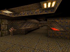 ![]() This is the latest industrial base level from Tiddles, and follows the same trademark style exhibited in Outpost-alpha, Strong-hold, and Valour (all reviewed). Fairly simple designs, all sticking to the same strong theme: grimy concrete and rock walls, lots of metal trim, with plenty of grilles, vents, and hi-tech lights as details. Add some crates, season with lava, stir in plenty of base enemy, garnish with the usual professional build quality, and serve on the TEAMShambler menu for hungry Q1 SP diners. This theme is becoming formulaic now, but it still works and provides a good level. Architectural highlights include a couple of good open rooms, the bigger pillared one is quite impressive, and the long corridor with angled vents above lava "shelves" on each side is an interesting design. Otherwise, the designs are simple - sometimes too simple and square - but good details like lights and pipes make them attractive. This level would definitely benefit from more spectacular architecture, but what's here is done well. Gameplay provides an equally straightforward experience, with no secrets to find and no exploration along a linear route to the exit. There is some backtracking through the map, but a few reinforcements keep you busy. Combat revolves around the usual base enemy, with a few Ogres to spice things up. Enemy tend to attack in gangs, which works well with base enemy, in particular the cool sentry posts. These are sealed rooms with long narrow slits from which multiple Grunts snipe at you, a good test of your aiming skills to kill them quickly. Elsewhere the combats are quite obvious, though the plentiful enemy can provide a fair challenge, with careful sniping being a good tactic. However the ending is weak - you get an unnecessary Perforator (until this point, weapons and health are well balanced for the combats), and although it's fun slaughtering the Grunt cannon fodder, there is no satisfying climax to finish. But for a quick burst of Quake action, it's a worthy map. - - - - - - ![]() |