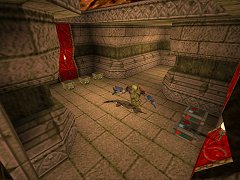 ![]() (Size: 1.05 meg. Above link includes mirror downloads.) ![]() ![]() Like Alk05, this level relies on a strong, original, consistent style for visual effect, rather than any diverse or spectacular designs. The theme is an Egyptian palace, at least in the textures and details: Sandstone walls, gold buttresses, and rich red buttresses with torches set in. Some pale green textures give it a curiously mildewed look, while occasional hi-tech-ish doors look out of place. Designs are quite simple, the map is based around a two storey selection of sometimes basic rooms and corridors. The most impressive architecture is in the larger outdoor rooms, the smaller in-between sections are stylish, but repetitive. However there's a great use of angles throughout, and the build quality is consistently good. The level needed more diversity in designs - temple fronts, more 3D sections, use of water, for example. It's a bit like a custom DM level in that the eye-candy comes from good texturing and details rather than structures, but being SP, more impressive structures could have been used. Progression round the map is good, as there is some non-linearity and a clear choice of routes through some sections. With the distribution of weapons, all paths are balanced. Secrets are simple though. Like the design, the gameplay's main strength - and weakness - is it's consistency: Combat is steady and unrelenting through all areas, with plenty of monsters (including Snakemen), all sections well used for fighting, and plenty of teleporting monsters appearing to keep the combat flowing even when backtracking. But it's not overwhelming as the map design makes it easy to channel monsters to where you want them: I.e. backing away from monsters shooting, or just ducking behind the nearest corner if they dare fire at you. It continues like that throughout the level, and provides a war of attrition rather than any especially challenging combats - the finish, against a toughened Deathknight, is easy to escape from. Items are in good supply, tending towards ammo more than health, and with the secrets the balance is very good. However the combats can be too similar, and the only slightly effective skills settings might make it too hard for some players. - - - - - - ![]() |