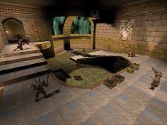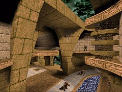 ![]() (Size: 600 k. No Alternative downloads.) ![]() ![]() Another temple style map, though very different: It combines two of Pingu's similarly styled deathmatch maps, converted to single player by Mike Woodham. The style is a mixture of plain sandstone and marble textures, hieroglyphic trim, murals and spotlights, all wrapped round very curvey architecture. This includes curved tunnels, domed ceilings and arched doorways, and goes from smoother curves in the earlier sections to sharper arches in the last area. All of it looks very good, with a lot of variety in designs from small corridors, spiral stairs, outdoor courtyards and large, open rooms, all kept consistent by the strong theme. Lighting is done well too, bright in the outdoor sections, darker and clearly sourced indoors. A few flaws - texturing round the curves can be a bit odd, the end area isn't quite as refined as the rest, and it doesn't have the variety of dramatic designs as A3. The map is very linear despite it's deathmatch origins, only the end has a minor route choice. There are a couple of neat secrets - one of them using a novel design - that also provide fun after you've got the items =). Combat is very good, and packs a lot into the map, with all areas having plenty of action. Noticably, good use is made of the 3D DM designs, with Ogres, DeathKnights and Vores providing much vertical harrassment from ledges above. Due to the design, combats are quite diverse, and test a wide range of skills, but are well balanced for difficulty. Health, armour and ammo supplies are all fair - there are plentiful grenades, but then again it's harder to grenade monsters on ledges above. There are some fun surprises too, using tougher enemy, which combined with the 3D design, give the map a good challenge and make the ending a worthy climax (Tip: When jumping backwards off ledges and firing lightning gun at Shamblers, avoid falling into any water pools =)). A great map, and a very successful conversion. - - - - - - ![]() |