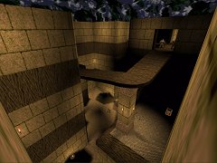 ![]() (Size: 1.1 meg. Alternative downloads: Dazsp2) ![]() ![]() Another temple style level, another very distinct execution of this theme. The main architecture is dark, atmospheric, deserted "city" courtyards, with tall, squarish (though slightly rounded off) "buildings", walkways, passages and arched windows. This is textured in clean sandstone with wooden banding, giving a strong style which shows how good simple but dramatic designs can look. Since it's a Daz map, naturally there are some diverse design styles mixed in: a sort of temple bunker style, angled corridors, rock sections, and various other designs in the temple style but quite different to the rest of the map. Textures mostly work well, with nice details, but sometimes are too plain (though this is fine on the buildings), sometimes the combinations are a bit too busy. With the gloomy night-time setting contrasting with strong torchlights, and little touches like piles of windswept sand and broken tiles, this map has a great, eerie atmosphere. It would have been better sticking to fewer styles and exploiting them more - especially the main, original city style, and enhancing the atmosphere with more broken sections and ambient sounds too. Still a cool map though. The lack of exploration - and any secrets - is disappointing given the map's design. The map feels like it should have more obscure places tucked away to discover. Gameplay feels exploratory though, not through route choices, but through the style of the map and the initially sparse combat. Very few monsters at first and it seems too easy, but definitely gets trickier later on, with some surprises. Monsters are a bit sparse but the challenge comes from the way they are used and having to take care with health and ammo. Monsters tend to lie in wait, and when they *lurk* in shadows it's a great touch. Ammo is rather tight, doesn't seem so at first but the later on it might - first time I played, I had to run past the final monster as I'd missed some supplies earlier on, doh. So it's best to be careful. The combat fits the desolate feel, it could have been enhanced with more monsters lurking in obscure places and a bit more ammo to compensate. The strong feel of the map stands out more than the gameplay, definitely worth getting for that. - - - - - - ![]() |