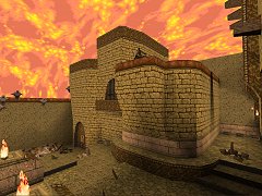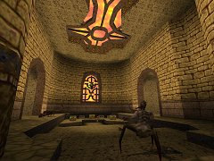 ![]() (Size: 890k. No Alternative downloads.) Speedrun demo: 0:37 ![]() ![]() Note: This level requires the Scourge of Armagon mission pack to play. Mmmm, a fresh new Arabic style, so well themed you can almost feel the millenia of religious hatred and conflict :P. Almost....you're more likely to feel Centroid nails spiking your arse to the walls. The map consists of interlinked courtyards and complex outdoor sections, with the main "fortress" of the map set into natural rock. There are a few indoor rooms and connecting tunnels, but mostly it's open to the glowing sky (nice sky but somewhat pink with the Id gamma patch). It's textured in sandy stone and bricks (including a good use of some of Id's crappier textures), with a mixture of luxurious brown/gold trim, and the ubiqituous rivetted metal trim - some of which doesn't look right and could have been used more consistently. Architecture is varied and complex - each area has something fresh to admire - but held together with the strong theme. There's lots of little buttressey bits, angled, looming, rocks, cool curves and arches, with some great cross shapes and window designs, and some wall fittings and light details - lighting is good too. All very stylish, hardly anything to fault except a few areas look a bit haphazard in the way designs are thrown together - the joins between disparate designs could be smoother. The layout is a good, most areas are visited several times and explored at various levels - nice to be able to access rooftops. There's little exploration, but 3 useful secrets, 2 easy and one tantalisingly visible secret that took me ages to find. The gameplay uses limited monsters: Lots of SOA's Centroids, and flocks of Scrags, with nothing easier than the latter. This "medium" monster choice ensures almost all combats are challenging, but some variation and "cannon fodder" monsters (Zombies being an ideal choice) would be better. Weapons and ammo are in very liberal supply, but health is somewhat sparse. Combats tend to be straightforward, and favour a lot of ducking and shooting, though there are a few tricky surprises and monster traps (sometimes avoidable if you're cunning). The SOA monsters sometimes get stuck on scenery, which makes them easier than they should be. The gameplay is good in general but has the classic flaw of being harder to start (weak weapons, no armour), and easier to finish (all weapons, lots of health and armour). Overall a great map that shows off yet another fresh Quake style very well. - - - - - - ![]() |