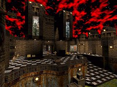 ![]() (Size: 1.1 meg. Alternate download: Jjspq3) ![]() ![]() A medium size industrial level, clad in a cool, distinctive texture scheme, with a checked floor, brick or rusty metal walls, heavy rivetted metal trim and urban / political posters. The map is very consistently themed with both it's textures and architectural style, which consists of heavy, dominating structures with plenty of stylish angles. Perhaps it's too consistent as some more design variety would be nice. The layout consists of several open, grass floored areas connected by broad corridors, all with crates casually scattered around. The best architecture is outdoors, with thick wall buttresses and ominous towers forming a impressive castellated skyline against a blood red sky. Inside the omnipresent angles, as well as nice vents, doors, and lighting details, keep the map looking all good. The lighting itself is richly contrasting, and the overall effect is a map style that's very original but still totally Quake. A couple of flaws are a rather crude rock texture, and a lift that disappears from some angles. The layout is simplistic enough to prevent exploration, the map as a whole is fairly quick to play through. There is at least one secret (the number is obscured by the map name), which I didn't manage to open. Gameplay is quite distinctive though not necessarily in a good way. Combats are set up quite normally, initially against base enemy, with some tougher medieval monster providing a bigger finale. Generally the fighting is straightforward and fun, a mixture of sniping enemy from a distance and facing some lurking enemy up close, with a few tricky, trappy ambushes that are more challenging. Weapons are in good supply for the enemy you face. Health however, is extremely limited, with a grand total of 70% health for 70 monsters on Hard (and a Green Armour). Thus avoiding damage is most important, though the map design does allow easy dodging and hiding. Skill settings give a bit more health and slightly changed monsters, but I suspect the balance could frustrate some players. Also, the cool ending section isn't used for combat which is a waste. Overall, however, the great style and designs, with reasonable combat setups, make this well worth playing. - - - - - - ![]() |