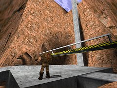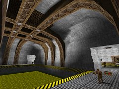 ![]() (Size: 890 k. Alternative downloads: Thepit) ![]() ![]() Note: If you play this map with WinQuake, you may need to start a new game *first*, then bring down the console and load the map, otherwise Quake may crash. A level in an unusually clean base style. Plain, pale grey walls and bright industrial trim are prominent, along with bright, contrasting lighting, which gives it a theme more suitable to Half-Life than Quake. It can feel rather sterile, and may not be to all tastes, but this style is portrayed coherently and the map is fairly well built. The base consists of several slime pool "hangars" and darker blue computer control rooms, set into natural rock pits, connected by rock tunnels and walkways. The rock sections are the perhaps best part of the map - properly angled, carved tunnels and walls, with an excellent rock texture (derived from Daikatana, I think). The main hangars and rooms are also done nicely, with good, strong, arching beams and some curved corners, though sparse details and some bland areas. Despite the more "realistic" look, it's really just a collection of rooms, there's no central focus to the level. More large scale structures and machinery, such as the lone crane already present, would have enhanced the theme. The level has very good exploration at the start, with a wide choice of areas to explore initially. There are also 4 useful secrets - be careful getting out of the slime, the ladders can be tricky, try looking straight up and pushing forwards, then jumping. Gameplay is quite fun in it's own perculiar way - a game of two halves, initially easy especially if you explore for items, then with a sting in the tail. Mostly you face the usual base enemy with appropriately weak weaponry, it's low key running and gunning, and it might seem too easy for many players, despite a couple of surprises. Skill settings are very effective so it's playable for anyone. But near the end the challenge escalates via a party of tougher monsters, that can be tackled via caution or bravery, and provide more excitement. Like the design, the gameplay needed more focus, such as carefully planned combat setups, but it's still quite pleasant and an interesting, original, setting. - - - - - - ![]() |