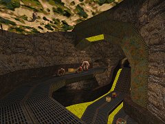 A deathmatch map with a fully playable single player mode. The map is a small section of industrial base set into natural rocks, with lots of cool slime features. Architecture is excellent with very curvey, fresh designs including domes and spiral stair sections. There's also a fair bit of variety from a hollowed out outdoor section to rounded tunnels. Textures are equally good (if gloomy with the dark, well sourced lighting), with some nice curve detailing. Slime flows around stairs and overhead through arches, a cool touch. The map is very small for single player, with a spiral, linear path. Gameplay is carefully structured and packs a lot of action in, including some gang attacks, ambushes from heavy monsters, and well placed lurking monsters. It's fairly challenging, though items are balanced until the slightly-too-easy end, and skill settings are in good effect. Short, but very stylish and quite fun. - - - - - - ![]()