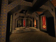 ![]() (Size: 990 k. Alternative downloads: Rumours) ![]() ![]() A largish level that covers a variety of Quake's medieval themes, from beige brick through rusty metal to green and slimey. Though it's all medieval, the different themes make it a bit incoherent. A small industrial base area, however, does work quite well in a covert way, and the lighting and sounds give it a fairly good atmosphere. Architecture is similarly diverse, with a few obvious setpieces having the best architecture, like a stylish, detailed medieval hall and a couple of rooms with good metal beam designs. Other areas, though usually containing interesting details, are less impressive and lack strong designs. This is sometimes due to the small scale in those areas leaving less room for designs, but the difference between the setpiece areas and the other, plainer areas is too obvious. However, textures are fine, and there's good details spread throughout, in particular the cool, consistently used, torch holders. Some details like a spear rack and a water trough would be better in a more "realistic" level. There's plenty of good ideas in this level, and they sometimes leads to good designs, but needs more it coherence and better designs in the minor areas. The key / rune grabbing mission gives a large route choice through most of the map - both routes being completely seperate and well balanced, with one exception. If you choose the rune route first (i.e. through the water by the medieval hall), the ending climax occurs partway through the map. Also there are 3 useful and fairly straightforward secrets. Sometimes you'll need to hunt around to progress. Gameplay is quite pleasant if you're careful, and fairly tricky rather than outright challenging. There's plenty of monsters, but they aren't thrown at you in unsubtle gangs, instead monsters lurk and lure the player into close confines. The combination of a small scale - which may feel too cramped in places - and dark areas, makes this combat tricky. But, played with caution it is fun and fair, and more satisfactory than charging straight in. There are some well set-up traps and ambushes, though the "pit of a thousand spawn" may be frustrating if it's not avoided. The ending (assuming it occurs at the end), is a good finish, not overly challenging. All items are in good supply, spread throughout the map, and skill settings are very effective so all players can have a go. - - - - - - ![]() |
