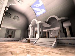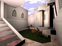 ![]() (Size: 1.4 meg. Alternative download: Kjsp1) ![]() ![]() Note: If this map is played with the Idgamma patch, the white textures will appear as plain and undetailed. A large temple map with a fresh new theme - fresh is the operative word here, as the combination of white walls, bright blue sky, and bright lighting give the map an unusally clean and airy feel. This theme works pretty well in Quake, as the general "light" feel is balanced with an exotic and arcane vibe. Textures are modified from the classic blue Ikspq series textures, and are well used with smooth brickwork surrounded by more detailed trim, highlighting the designs and ensuring that all areas have enough visual detail to look good. Architecture is also good and sometimes rather impressive, with a variety of Arabian temple structures ranging from convoluted archways and supporting pillars, to curving ceilings and domed buildings. Curves are used well on such designs, and some cool little outdoor areas spice up the map too. However some connecting areas are too simple and bit more connectivity overall would be nice. The map has a bit of exploration, with a couple of route choices when pressing buttons or collection keys, and the occasional side area to explore. There's also 3 secrets, of which at least 2 are easy and useful. More exploration and secrets would have suited and enhanced the exotic style. Gameplay is good throughout, though it will probably be on the easy side for some Quake veterans. Very fair supplies (especially if you find the secrets), combined with the escapability of almost all the combats, make this map quite amenable. The overall map balance is also good, gradually escalating from a very easy start, via diverse combats, to more hectic fighting against several tough monsters near the finish. The occasional ambush spices up the combats, and monster infighting can occur quite often and provide extra entertainment. Skill settings are very effective, so all players should have fun with this map. - - - - - - ![]() |
