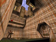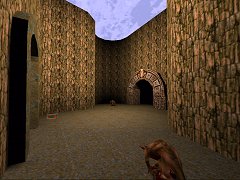 ![]() This is a small, simple, straight up and rather neat map. The design is quite simple and 2D, there are no extra frills, but it is extremely well made (with an almost professional air), with excellent architecture and some nice details (check out the rift in the main room). Particularly noticable is the good use of many curves both in the outdoor areas and some corridors, and on the rounded off pillars and arches. Curves are sadly lacking in many maps, and they certainly make this one very attractive, along with the lighting which is nicely done in places (like the contrast between the start and finish areas). Gameplay is very good, but unfortunately a lack of monster balance gives rise to the only disappointment in this map - the fighting is mostly great, facing combinations of Scrags and Ogres, and facing some monsters in numbers, but always with room to move and sufficient ammuntion. However, towards the end of the map, the monsters just seem to disappear, and once you recieve an unnecessary Quad, it's all over with a noticable anti-climax. This is a bit of a pity (and a common flaw in many maps), because just with 10 more monsters at the end, the map would have been excellent all round, nevertheless it is still very good. Highly recommended as long as you don't expect a spectactular ending. (Did a Nightmare speedrun in 0:58, also on the Demos page.) (Size: 900k. Alternative downloads: Rc1 / Rc1) Speedrun demo: 1:11