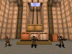 ![]() A somewhat unusual map in that it uses the Ikbase textures, popular amongst deathmatch map makers, but until now, only Ilkka's original Ikspq5 and the fantastic Casspq1 have made good use of them in a SP map. This is definitely a good base map (though it's maker, Fat Controller, insists on denying that it's any good!!!), varied, some cool rooms and architecture, and all round great gameplay. The rooms are varied in design, mostly they are good, especially the first room, but a few seem a bit empty and purposeless. Architecture is the same, mostly it is really good, but in some places it's a little less detailed and a bit too square - however, it all sticks to the theme well with the usual base touches (I especially like the entirely different atmosphere in the grimy underground cellar), and the design is never low quality. Gameplay is where this map really suceeds, there are many different gameplay situations, and all are fun - places where Grunts pour out of opened cells, where Enforcers appear on rafters above you, where you are trapped in the cellar with a bunch of nasty monsters but plenty of cover to hide behind, and the ending, though slightly too easy (yup!), is a fun battle. The only real flaw with balance is that some of the items and secrets are a bit strange - the Quad is almost useless, while the second Red Armour secret makes the ending too easy. Another nitpick is that sometimes the cool hexagonal corridors are awkward to move in, and the ladders are also tricky to use, but that's of little consequence - overall it's a fine and interesting map. (Did a rather cool Easy speedrun in 1:11, also on the Demos page.) (Size: 3.0 meg. Alternative downloads: Jzspq3 / Jzspq3) Speedrun demo: 0:51