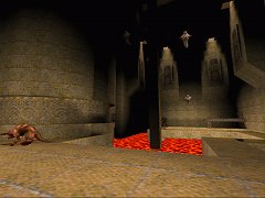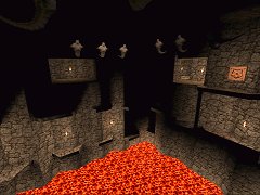 ![]() A large and impressive level, both in layout but more prominently in room scale, that is very reminiscent of earlier Mexx levels (which is a good thing) - there is even a cheesey story to go with the level, but it doesn't really compare to the Bishop saga. Basically, it's a big, tough medieval level that has plenty of variety and keeps the challenge going from start to finish. The theme is adhered to well, and there is a pleasing contrast between the cleaner styles on the surface and the darker, grimmer styles in the bowels of the level. Architecture is good, though it could do with a little more detail in some areas there are still some impressive sections, most noticabley the outside areas and caverns (I love the huge shaft in the first cavern!). However you pay a price for the cool outdoor bits - the main outdoor area is rather slow - not unplayabley so, and not bad given it's size, but a bit choppy. Gameplay has a similar Mexx quality - it starts challenging, and keeps up the pace right to the end - and the end is satisfying because areas you have passed through fill up with "returning" monsters for your killing pleasure =). You do get plenty of shells and room to manouvre, which increases playability - but I wasn't impressed by the Shambler near the start - I thought that was a bit OTT given the lowly weapons and lack of cover. There are a couple of other potentially irriatating flaws - there are quite a few areas that you can fall into and not escape - in fact one I jumped into deliberately because there were a couple of Shamblers that needed a good Quadding, and then I had to "noclip" out, and there is one annoying section where you have to repeatedly jump up large steps above lava - this added nothing at all to the level. However, these flaws can be avoided with caution and saving, so this level is definitely recommended. (Size: 900k. Alternative downloads: Junk / Junk)