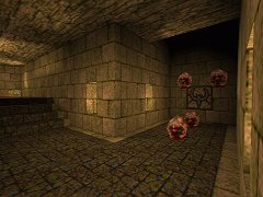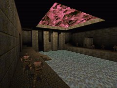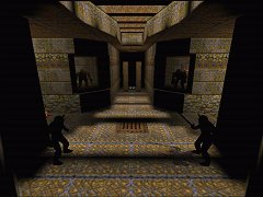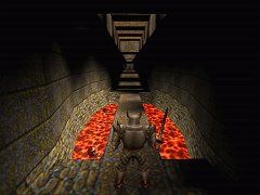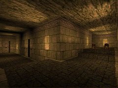 ![]() Now this is an unusual treat - a map clad entirely in Rogue's delightful "temple" textures. This style is one I have never seen in a decent SP map - a great pity as it's definitely one of the more attractive styles in Quake (for futher proof, have a look at some of the excellent temple DM maps, such as Debello, Ultrav, Fribdev1, Chesdm1, Jndm6.....). The author has used the textures extremely well, with a perfect balance of uncluttered surfaces enlightened with some fine details, and a nice rock ceiling - the overall effect is very complete - nothing seems out of place or poorly used. The downside however, is that the architecture and layout is mostly very simple (and quite small, though that's fine) - this is a corridor based map, with just a few small rooms, and as such there is little design flair shown here, though it's simplicity is quite effective when combined with the textures and lighting. As a contrast, one of the only real rooms, while small, is fantastically detailed, with a superb ceiling - you end up wishing more rooms like it had been included. Nevertheless, this is not a problem as such, more of a potential improvement. The gameplay shares a similar, but even more effective simplicity - it's a classic run and gun scenario, spiced up with a few surprises, and and a somewhat
