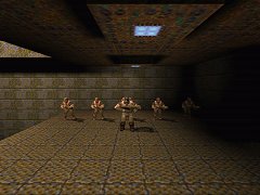 ![]() Important Note!!! This map follows directly on from Tomb, and does not have any weapons of it's own - see review for more details. The second map in the "Mymap" zip, and you should know what to expect by now - simple but effective design with precise textures, and simple but solid and satisfying gameplay. And this map does indeed live up to that - it also shares and accentuates the author's willingness to play with themes - this time it is a metal map, but with no lava (water instead), but with a full, well, *garrison* of base enemy, alongside some maverick monsters to spice it up. This blending of styles works very well, and gives the map a cold feel of some bleak, prison like outpost. The architecture in it's usually simplicity, fits this well, though there are plenty more interesting (if mostly 2D) rooms, with some nice bunker like constructions. The map definitely feels more open, perhaps to give the legions of Grunts and Enforcers a clear shot at you =). Texturing is good, though not quite as detailed as his other maps - though the slightly more complex design balances this out. As for gameplay - well there lies a tale to be told.... This map follows directly on from the Tomb map, but there is no indication that it does. Thus it includes plenty of ammo, but no weapons whatsoever as you should have them from Tomb. I didn't know this, so played the entire map with the shotgun - and amazingly it was mostly very reasonable - since it's just base enemy and Ogres for most of the map, and *always* with room to manouvre (which is nice), it's quite playable. However when I got to the end, and the somewhat superior enemy, I got rather puzzled (especially since there is approximately 3000 nails at the end!!!), and went back through the map 3 times with "r_fullbright" on - no weapons. So I assumed it was a beta or the author had screwed up, nimbly outwitted the end monsters (after a couple of attempts), and finished - it was still fun. Then I played Tomb,