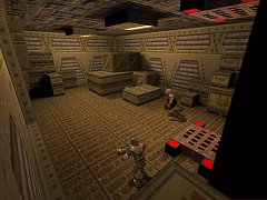 ![]() Yet another base map (for some reason, map authors tend to make more good base maps than anything else - maybe because the base styles is simpler and easier to do - less monsters, more "normal" architecture etc.???), but like many base maps, it has some subtle differences that make it stand out from the crowd. In this case it's two features, firstly the "storage" theme of the map - as you might guess there are crates everywhere, which is no bad thing (a lot of Q2 maps use large amounts of crates quite effectively), as it gives the map a strong theme, and makes the fighting areas more interesting, with both crates to hide behind, and enemy lurking behind them - also crates, while simple, are not unattractive if used right. Secondly, the style of this map (texturing especially) strays away from the usual base whites and beiges, rather it has a much grimier and earthier feel, with some wooden crates, bunker-like corridors and generally brown textures - the overall effect is quite realistic and pleasing. The architecture is good, while simple (though not boring) in places with the corridors and crate filled rooms, it is livened up by some good details and a few impressive structures (see screenshot) - also check out the final lift for attention to detail. Gameplay is good, as it often is with base maps - the usual Grunts and Enforcers get some heavy support from Ogres, which adds some spice. Also in a few rooms, the maze of crates means you can receive thought-provoking attacks from various angles. Sadly as you might expect, although gameplay is well balanced throughout, there is no big climax at the end - obviously it would have been more satisfying if there had. However, there are a couple of potentially serious problems with the gameplay that could put the easily offended off this map: both the silver and gold keys require you to find "secrets" - the gold key is revealed when you hit a "secret" button, and you can only escape from a nasty laser trap (which itself is a bit annoying) by the silver key by shooting a hidden floor panel. Although I got the gold key easily, and what's more rather cleverly found one of two other ways to get out of the silver key area (email me if you find both alternative ways, and you will get a prize or something. Well, probably not a prize. But fame at least.), I still find this problematic as I could have spent too long wondering around the map, that would have been frustrating. So when you play this map, have a good look around and keep your eyes fully open!!! There is one other, but less serious, niggle - there are no "real" secrets in this map, and given the plethora of crates, it would have been ideal to have lots of secrets - on top of crates, behind crates, just everywhere!!! A pity that this wasn't taken advantage of, but overall the map is good and the unusual style is nice. And don't worry too much about the problem with the keys, just email me if you get stuck. - - - - - - ![]() |