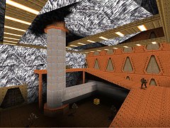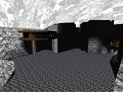 ![]() It's Christmas....December....mid-winter....cold.... So what better way to spend this chill season by firing up the heating, firing up the P.C., and firing up good old Quake??? And what more appropriate level to play than this full episode set in a bleak and frozen mountain base??? Yup, it's time to wrap up tight, put on a big, furry, and slightly amusing hat, and enter the icy realm of Schist. You can guess the story with the Schist base - some brainless cretin in the base has been exploring too far, discovers a hidden portal, and suddenly there are Quake forces everywhere....so the only solution is to send in one single marine to stop them =). If you don't want to guess, there is a very brief background in the text, worth reading as it all ties in nicely with Quake. Onwards to the maps, and this is a full epsiode, containing a start level, 3 base themed levels, 1 metal themed secret level, 1 medieval level, and an arena style final level, all of which are individually sizeable and liberally decorated with a wide and varied array of custom textures. In fact, if I had to chose one defining feature of this episode, it would be the highly distinctive snow and ice textures which are prominent throughout the base levels - not only do these give the base a unique look, but when used with the steely grey water and ice cliffs in the outdoor areas, give a truly *cold* feel (see screenshot below). This is really quite atmospheric, and provides a convincing sense of "place", especially with the chill grey sky, which is the most dramatic use of sky I have seen since Zerst�rer's evil night time sky. As I said, this is the thing that left the strongest impression on me in this episode. The textures elsewhere vary - the interior of the base is interesting enough, but can clash a bit, the secret level is attractive enough, but doesn't really have enough architectural or textural details compared to the rest of the episode. The medieval level is the best of all, with a distinct pale stone and wood style with is greatly enlivened by some excellent wall details and stained glass windows (see lower screenshot) - also the medieval map contains some varied areas such as the tombs and the lower caverns, both of which have their own interesting style.