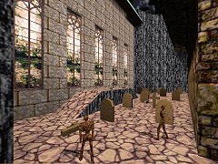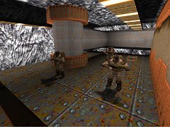 ![]() Last, but not least, gameplay. Overall the gameplay is very good, and increases in intensity throughout the levels to a proper climax (well, sort of, see later on...). The base levels are fun to wade through, with lots of enemy, can be fairly challenging in places, especially the last level, with it's more complex designs (which gives more angles of attack) and increasing use of real monsters. The secret level has a good level of challenge between the base levels and the medieval level. The medieval level is where the action really hots up - after a brief transition from base enemy, you have some fun fighting Death Knights and such, then after dropping into the black and malevolent lower caverns, a worrying and immersive fight with multiple Vores, then multiple Shamblers. Given the gloomy and slightly confusing situation, this fight provides real interest, and for me it was the true climax of the episode. However, after this there is a final map with a fight against Chthon - fine you might think, but actually the author has attempted to spice up the fight with Chthon by placing you in close proximity with little or no useful cover. Rather than being exciting or dramatic, this is extremely boring, and took me dozens of attempts, saving after each switch. This was quite a disappointment after the previously fun gameplay and exciting underground battle, and spoilt the end of the episode for me. If the rather spacious final map had contained increasingly frantic encounters with tougher monsters - such as being trapped with several Fiends in Chthon's room - this would have been a lot more enjoyable. Still, given the size, originality, unique style and fine gameplay in the episode, there is much to enjoy progressing through these maps, so cheer up your Christmas with some vicious Quaking violence =). - - - - - - ![]() |
