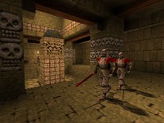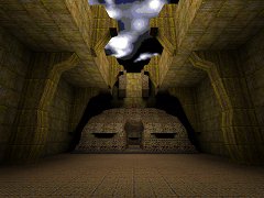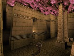 ![]() When I reviewed Tomb, I said that the temple style was "...one I had never seen in a decent SP map..." - doh!!! Time for me to eat my words, as aside from the Lost Island (to be reviewed at a later date), there is this temple masterpiece - how could I possibly forget it??? This is an claustrophobic Egyptian themed temple par excellence - it sticks to the theme perfectly. You know, I tried, I tried really hard to criticise the theme, the style, and the architecture of this map....but I couldn't. Yes the architecture could be improved: it could be more angled, and the small scale design could be made more spacious, but given what the level sets out to do, to create a templesque labyrinth, the style is pretty much flawless. The architecture is perfectly consistent throughout, yet the immaculately applied textures give variety, between sandstone, engravings, terracotta, and dark balsatic edifices There are plenty of details in almost all areas of the map, both design touches as pillars, subtle angles, braziers and sarcophagi, and in fantastic textural detailing - aside from the few plain connecting corridors, every room has something of visual interest. And what is more, it all fits together extremely well - a great example of adhering rigidly to a theme, yet exploring variety within that theme. However, aside from the beauty of it all, there is one distinctive design feature that may not be to everyone's taste: the map is designed on a noticabley small scale in most places - even the larger areas are, well, smaller, and the corridors are very narrow. Personally, I found this was not in the slightest bit detrimental to gameplay (even beneficial in some places), and indeed it added to the labyrinthine atmosphere. But if you are claustrophobic, you may find this rather cramped. Although you are generally forced in one direction as far as the layout goes, the style of the map gives a reasonable illusion of exploration, and there are a few secrets, though strangely balanced in places. Onto gameplay, and though this is a lot of fun, it doesn't quite live up to the high standard set by the design. The gameplay has it's own flavour, as the scenery precludes charging in and outmanouvering the monsters (which, needless to say, fit well with the theme). Rather, the design encourages a "shoot and duck" style of fighting, which is nice for a change, though less exciting than the normal Quake gameplay. As far as this style of fighting goes, the tight architecture does work against some monsters, making it easy to bottleneck them in doorways. In other places, they can surprise you in cramped places and be more effective, and there are a couple of good surprises. The main disappointment, after fun, well balanced and consistent gameplay throughout, is that the ending is just to easy. Although the ammo is well balanced up to this point, the prescence of the lightning gun and only one final monster makes it an anti-climax. Also worth mentioning - there are 2 death traps, one is indicated, which is fine, while the other isn't, which is not. These are not too detrimental though, and given the style of the level, I can recommend it pretty much unconditionally. (Size: 1.2 meg. Alternative downloads: Sadlark 9 / Sadlark 9)