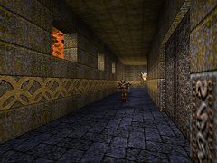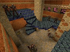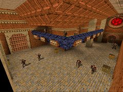 ![]() Dressed in a blend of terracotte and blue brick, and packed to the gunnels with 110 monsters, this is some citadel. A very meaty level, but will it spell your doom??? Nope, I don't think so, but it should provide a lot of fun. But before gameplay, architecture, and the architecture in this is a mixed bag. Some areas, such as the initial building front, are rather impressive, and some interior areas such as the girdered pool and the final room are equally nice. There are also some good details, like spiral stairs and the detailed windows, but in a few areas the architecture can be a bit bland and unpolished. There is also sometimes a clash between the terracotta style and the blue style - both of these are individually attractive themes, but don't always fit together. In short, the architecture is good and well made overall, but you're left with the feeling that a lot more attention was lavished on some areas than others. An attendant problem with 2 of the larger and more detailed areas is that the map slows down quite noticabley. This occurs in the initial outdoor level, which is not so important, and the main L shaped hall, which is more detrimental due to the amount of action that area sees. This is not a serious problem due to the space to move and the nature of the combat in this level, but some choppiness is noticable. The room designs are varied and support a variety of combat. There is not much exploration, but there is a lot of back-tracking through the level - this is made worthwhile by having reinforcments in almost every area you return to. The gameplay is the best feature of this map - it is of a perculiar flavour, in that there are a lot of monsters, but equally there is a lot of ammo and armour (including 6, yes 6, yellow armours!). This leads to carefree and fast paced combats, where you can wade through dozens of monsters knowing that you have the firepower to survive. This is enhanced by my favourite feature of the level, the use of "medium class" monsters, like Ogres, Knights, Scrags and DeathKnights in large gangs. It's rare that you meet any monsters on their own - groups of 3-4 are more common, and in particular there is a tendency for mass ambushes by DeathKnights. With the fire power to hand this can be really fun. As such, the level is not particularly challenging, as there is always enough room to fight and few worries about surviving - only in a few places does the combat become tricky. The end is a bit disappointing, it certainly has potential in the design, but with the amount of weapons and protection, it's just too easy. There is also one trap in the level, but it is marked and indeed escapable if you have the requisite skillz. It also has some fun potential...lets just say that the trap is not just restricted to killing you. Overall, a good level with simple and violent fun involved. (Size: 750k. Alternative downloads: Fatalpla / Fatalpla)