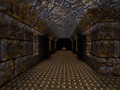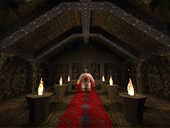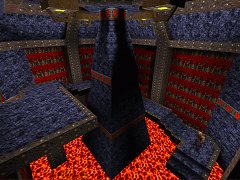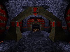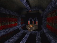 ![]() Welcome to the wild side....prepare for a hardcore headbanging balls-to-the-ceiling Quake experience!!! Oh yeah, this is some level, containing a start map and two huge levels, all featuring more gibs, more teleporting monsters and more in your face and up yo ass surprises than you thought possible =). Anyway, enough with the raving already, onto the levels... They have a pretty unique style, as you can see in the screenies - for the most part (in the main levels), a mixture of lurid bloodstained walls, heavy blue buttresses, pillars and supports, and plenty of runic details. However, there are some other sections off the main levels with diverse styles: The outdoor starting area, a rather twee little cottage (which was far too cute for this level or indeed Quake), and a medieval castle (which is completely different in style, and though simple, expertly themed and made, I really liked it). However, the blue/bloodstained/runic style is the most prevalent, and even overwhelming in some places: the sheer amount of it can get a bit repetitive, especially since it is such a rich style. Of course, the plus side is that it is original and creates a very strong theme that the maps adhere too. Also, some of the details are really magical - the floating cubes in particular, also the cool teleporters. The architecture is equally consistent, and very good indeed. Lots of subtle and effective angles, plenty of monolithic pillars, loads of good details like runes and lights, all combined to create an oppressive and well finished design - there are few "filler" areas in this, even the simpler corridors have a strong design purpose (usually to surprise the hell out of you =)). Additionally, the lighting is expertly used, with some areas that throb menacingly and many that remain in darkness until monsters appear - again contributing to the foreboding atmosphere. Overall, the look of the map is very interesting, and even if you don't like this particular style, the attention the author has put into making it is evident throughout, this is definitely a *crafted* level. The layout varies from map to map: the start map is very simple, the first map is convoluted and winds around itself, with some side missions, the second is more corridor based, and feels long and involving. There is not much exploration, aside from the secrets (which are good) and a choice of missions in the first map, but the unique feel of the level certainly drives you on!