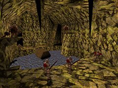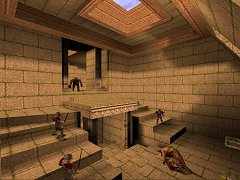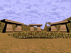 ![]() Or to give it it's full title "Lost Island: The Island of Death". Which is nice. Well, hey, you wouldn't want an island of peace, harmony, cute animals and pretty flowers, would you??? That would just be silly. Anyway, what you get here is a 2 map mini-unit, with a start map, that all fit with the "lost island" concept very nicely - sort of Quake with an slight Indiana Jones feel. The maps are done with a clear temple/outdoor theme, with lots of canyons and carverns, and a plethora of sandy temple structures to explore. Both maps adhere to this theme well, but include quite a bit of variety in designs. The start map also fits in perfectly with this idea, and is perhaps the best and most interesting start map I've seen. However, though the start map is cool and worth exploring, there is some water in it, from which you take major damage if you swim down into. Fine, because it warns you, but sometimes you randomly take damage from just swimming on the surface - a bit glitchy I think. No such glitches in the main maps, but one problem is that they do run quite choppily in places: a few areas in the first map were a little choppy, and the second map was a bit worse, sometimes dipping below 20 FPS. This was probably due to the fairly detailed outdoor sections, and while it didn't really affect combat, it is not good. The style of the maps is a combinations of two styles I'm particularly fond of: Rogue style temples and plenty of outdoor sections. However, neither of these are done quite as well as the could be: the temples are good, interesting and detailed in some places, but quite plain and square in others. The outdoor areas are plentiful and varied, with good use of water and cliff areas, but are hampered by the textures, which look a bit ugly and unnatural when used in such quantities - a better choice of rock texture would have improved these a lot. Also in the outdoor areas, some designs look artificial, and a few aspects look a bit "cute". Overall the first map has by far the better looks and designs, but there is some cool stuff in the second map: a nice little graveyard, and a cool megalith circle. Though the architecture doesn't quite live up to the theme, there are some good areas, some of the temple sections are great, and the maps are certainly interesting and original enough to keep you looking.