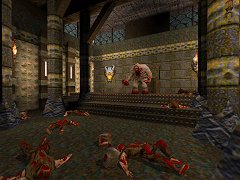 ![]() The Demon King: a full episode, including 10 maps (and various odds and sods like start and end maps), done in a full on fantasy style, with non-linear gameplay, a very basic but unfolding story, and plenty of atmosphere and exploration as well. So as you might guess you get a fair bit for your download, and it's a weighty undertaking. Before the review proper, there are some "issues" that are worth mentioning. Firstly: toughened monsters. Each monster has approx. 1 1/2 times it's original toughness. Is this good or bad??? Personally, I don't like it that much, it just means they take longer to kill, without making them more interesting or exciting. Secondly the gravity in the levels is slightly reduced - this is most noticable with the forest levels, but may be in the other levels too. I think this is fine, it's not altered too much, and actually makes Fiends more fun and effective. Thirdly, there is a bug (or possibly a feature) that when you return to a level you previously passed through, all the weapons, ammo and health are still there, but the monsters are still dead. I suspect this is a bug...how does it affect the game though??? Well, given the monsters' increased toughness, I found it pretty damn useful - I would have probably run out of ammo without the bug... make up your own minds about that!! Fourthly, one problem in the otherwise excellent church level, is almost unplayable slowdown. Due to the huge size of this outdoor level, not only does it run at under 15 fps in places, it also has r_speeds (a measure of the number of polygons visible) that often exceed 2000, maxing out at 2500. Given that r_speeds need to be kept below 1000, this leads to the level running very choppily indeed - thankfully there is very little combat in that area, but it is a serious flaw - especially since you need to make a jump onto rocks that is hampered by a low framerate (try looking at the ground). Got all that??? Now, this episode is, in part, sold on it's non-linear gameplay and plot...well, it's pretty thin to be honest, the gameplay is essentially collecting keys and hitting switches, except you find out what keys to get where as you progress throughout the levels. You need to find scraps of paper to reveal the key locations, and this does require plenty of exploration and hunting around, though it's not too confusing (pay attention to the scraps, okay???).