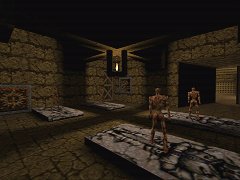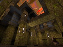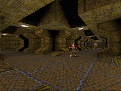 ![]() A straight-up, straightforward medieval level, with lots of pillars, buttresses and "sticky-inny / sticky-outy" bits. This level comes in two flavours: olive green for the lower sections, and dirty blue for the upper sections. Each section sticks to it's chosen colour well, with a well done join between the two, and the level has a strong and consistent style overall. Architecture is heavy and blocky - often it can seem quite square, but the good medium scale details, as mentioned, keep it interesting. In some places there is some good uses of curved arches and angled corridors, but mostly it is square with some subtle angles. There are a lot of pillars and ledge trims in this map, this adds detail and complexity, but can obscure rooms, giving them a vaguely maze-like feel. The coolest bit of architecture is a large octagonal lift shaft, big and nicely done. Elsewhere the room designs are good, some good use of 3D layouts, but the structures aren't as spectacular. I would have prefered less pillars and more impressive (and angled) "set pieces", but overall it's still a well made and good looking map for it's style. There is a bit of exploration, which is good - mostly just trying various routes before needing keys or switches. There are also some good secrets - quite hard to find, but some have a pleasing complexity, rather than just being holes in the wall. Gameplay sticks well to the medieval theme, with mostly Scrags, Ogres and Knights. These are all used fairly well, but not exceptionally, and the lack of suprises and shocks in this map was a bit disappointing. It's very straightforward gameplay, just normal running, shooting and retreating where necessary, no really clever combat setups. The top of the large lift was nice however, and generally the combat was fun and fairly continuous throughout the map. It's not that hard, as you've always got space to run away and lure monsters to you - though the ending is more challenging with the weapons you have, but not really a big climax. Again, the gameplay is good for what it is, but more shocks and clever setups would have made it more exciting. Worthwhile for a solid, well made Quakey map with normal gameplay. - - - - - - ![]() |