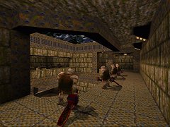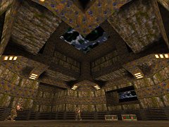 ![]() Note: Since software Quake doesn't allow map names over 8 characters, you will need to rename this map if you play in software. Those of you who are familiar with Tiddles' previous works (Mymap/Garrison and Tomb, see Archives 2), will recognise the general style and build of this map: simple squarish rooms and layout, but very well made and well detailed. However, this map is better still, as it retains the build quality and details, but has some more interesting designs and better use of angles. Tiddles' deathmatch mapping experience is evident, as this map has a strong DM style/theme (even including marker spots for the weapons!!). It's a futuristic metal/concrete base map, with grimy concrete and stone walls, lots of metal beams and rafters, and plenty of hi-tech details such as grilles and lights. Altogether a good strong theme that works well with Quake and is quite fresh in a single player map. The architecture is good, although the map and most rooms are fairly small, all areas are well made and attractive, just from the use of details, angles and subtle structures, rather than spectacular designs (again, this is common to many good deathmatch maps). The texturing and lighting are both clean and well done, and the build quality is high which is very pleasing. More spectacular architecture would be nice, but as simple maps go, this is very good. There is no exploration, and the map follows a linear route, with a lot of backtracking at one point - sadly there are no reinforcements to make use of this backtracking. Gameplay is as simple and solid as the map - you face plenty of base monsters and Ogres, with limited health to keep you on your toes. The monsters are mostly well used - Grunts used in numbers to ambush you, Enforcers tucked away in hidden sniping spots. The Ogres weren't so well used - until the end, they weren't very effective. Most combats are straightforward, though there are a couple of surprises and in some places the gang attacks require some thought. You get plenty of ammo and medium weapons, but as I say, limited health, which is good as it rewards care and damage avoidance - go in all guns blazing and you'll get in trouble towards the end. The gameplay builds up nicely from an easy start to a monster saturated end - this is good balance that many maps don't have. There are a couple of problems - the lack of reinforcements means that the backtracking is boring, and the lack of skill settings means that those who find it too tough don't have an easier option. Other than that, a small but rather nice map, recommended. - - - - - - ![]() |