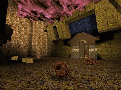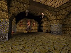 ![]() Tim brings the Darkness (reviewed) upon us again, with these grimy, gothic, medieval dungeon and castle maps. You get a start map, and two medium sized playable maps, all done in a fairly detailed castle theme, i.e. you get dungeons, a well, fire places, that sort of thing. But it never reaches the bland realism that Quake just can't do, this is all appropriately gothic fantasy style. There is a lot of diversity in styles between the maps: The first has an arched, earthy, feel, while the second has a variety of angular styles with a metal influence. Individually all these styles are good: they are atmospheric and there are plenty of details and designs to keep you interested. However, I felt some more coherence would have been better, with more consistent use of the better styles, as it can seem a bit thrown together. Architecture is mostly good throughout, with lots of interesting structures and details. The first map is a low key affair, with few major designs, but curved arches and "DM1" style murals providing interest. It has a good, dirty, dungeon atmosphere too. The second map has far more impressive designs, with some great castle frontages, some good pillared rooms, good use of angles and plenty of metal details (though the lettering is a bit cheesy). Aside from a more consistent style, there could have been more impressive designs in the first map, and also a bit more room to move, as a few designs are awkward to move around. Overall, these are atmospheric maps, that really fit Quake's style well. There is a bit of exploration in the maps, especially the first which has several areas to explore, and both have some good and useful secrets. Gameplay is where these maps excel, and Tim has really suceeeded in his quest for more challenging gameplay - these maps are as Quakily violent as you could hope for. There's plenty of medieval monsters throughout, with loads of ambushes and nasty shocks to keep you on your toes....Tired of just having a single Vore appear next to you?? Bored of those predictable Shambler ambushes?? Don't worry, this map drops *two* Vores and a DeathKnight on your head, while round the next corner, a Shambler *and* two Fiends welcome you with open claws =). These maps certainly capture the brutality of Quake perfectly, and you'll definitely want to be wandering around with your Perforator at the ready - I found this gameplay both challenging and enjoyable, in fact some situations brought a smile to my face with the sheer Quakieness of it all. However, it never lowers itself into the depths of "frustration", as there is invariabley either an escape route or plenty of ammo to deal with the monsters - you just need to shoot first and think later. Also, skill settings are effective, which is good. Balance is good, you start off slowly with a bit of thought (and hunting for a key) required in the first map, but gradually the monsters pile up in front of you. The second map ups the pace further, with more ambushes, heavier monsters and just more action. However, the ending is a bit of a let down: it's a trap type thing, that can be annoying if you miss the warnings, while the actual combat is easier to retreat from, and even easier with the powerups and secrets - this should have been a better climax. Up to this point, the gameplay is just great. Definitely recommended for some solid, gothic, brutality. (Did an Easy speedrun demo of Map 1 in 0:30). (Size: 1.30 meg. Alternative downloads: Moonlite)