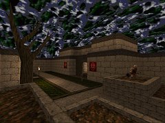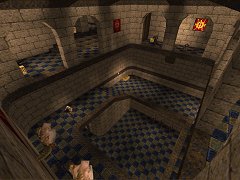 ![]() After Actaltraz, an epic base map, Tyrann returns with Moonlight, an epic medieval castle map. Like before, this is a massive 140+ monster map, that will provide a more filling and nourishing Quake experience than your average map. There is a great, atmospheric story behind the map, that provides a Quake-based background which cleverly touches on your mission from a distant 3rd person perspective. The essence is you are the remenants of a squad sent to retrieve a rune from a castle. And Lo!! That is exactly what you do. This map is a castle through and through, not in the traditional sense of having a moat, drawbridge, dungeons, etc, but rather a strong, very consistent medieval theme, with a great castle frontage to start you off - indeed, the start of the map is very impressive. Throughout, the map adheres to one style: pale grey stone walls, metal beam trim, and checked blue/grey floor, with plenty of arches, rounded off corners, and often cool "skyline" structures. Though the textures can be repetitive, there's plenty of variety in room designs to make up for it: 3D arched halls, spiral stairs, flat and open outdoor areas, smaller interlinking sections. All of which are attractive, with lots of curves used on arches and to round off almost every corner, and excellent build quality you can feel throughout. However, the architecture is lacking in a couple of ways: Firstly, there are very few textural or physical details, which means some sections do look quite plain. Secondly, the castle theme is potent one, and some areas, particularly the later outdoor areas, would have been greatly enhanced by turrets, spires and castellated walls. Still, this is a good looking, atmospheric and well polished map. There is plenty of exploration to do: secrets are simple, but there are several routes to follow, some of are entirely optional side areas to get weapons and armour (including some where you can see another, inaccessible, room you will reach a lot later, which is a good touch). This does mean you can miss out on some areas, so it's a good idea to explore everywhere you can. Gameplay is as solid as you could wish for in this map: lots of monsters, plenty of gang attacks, and no trick gameplay, just straight up fighting. The map uses just medieval monsters, and strikes a good balance with the monster types, which are all used in groups, but |