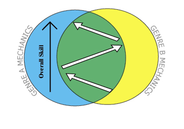 In a composite game, the challenges that the player faces bounce back and forth between the two genres. In SMB, this means that the game tends to alternate between platform-intensive levels with lots of open jumps, and action-intensive levels that feature considerably more enemies. The game never stops being both a platformer and an action game, but it tends to alternate its focus between them so that players never get bored of just one kind of activity.