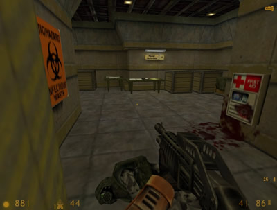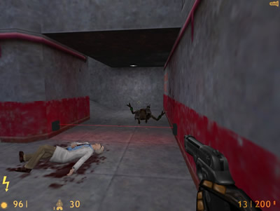 Of course, there are not floating icons like this in in Half-Life. In this set piece, a scientist and Headcrab are blown to bits, demonstrating the necessity of this piece of cover. We�ll examine a variety of cover descriptors in detail in the first two segments, but descriptors become more scarce and more abstract in later set pieces. Cover descriptors never disappear entirely, however, and we�ll see a few examples of their role in later set pieces too.