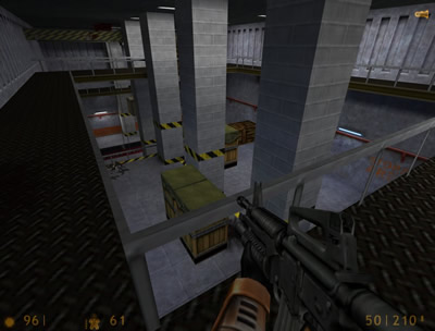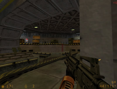 Most of this cover looks like ordinary walls and pillars; i.e., the kind of "cover" players might find in Quake or Doom. There are several important differences in both quality and quantity, however. In Quake, an enemy might chase the player character from one arena, down a straight hallway into another arena. There's no place to stop; everything is done by kiting and strafing. When there�s cover in Quake, it�s often an accident of the level design. In Doom, the player can make cover out of the terrain, but only because the enemies are slow and usually have a simple herd AI. In Half-Life, the enemies will act as individuals, shooting at medium range, charging at the player, and lobbing grenades. The player doesn't know what to expect, and as such, he or she can use the cover to buy time.
