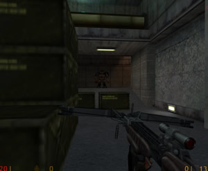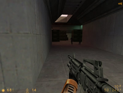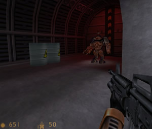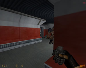 The player can use any of several apertures in the set piece because the halls and doors are narrow enough that they do provide some cover, and the enemies start far enough away that the player can actually take advantage of the cover momentarily. Fighting these scattered enemies in shallow cover is highly reminiscent of Doom and W3D, and is definitely a step back for Half-Life�s cover theme, although it�s clearly not an arena. Another unusual occurrence in this set piece is that the grunt opposite the armory will charge towards Freeman. It's hard to say whether it's the distance and obstructions that cause this or whether this one grunt has an altered behavior script, but the results are the same. The player has to quickly dispatch as many enemies as possible before additional scripts kick in, because after the grunt, more Vortigaunts can appear (although the teleport scripts are not as reliable here as elsewhere).
