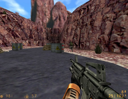 This segment of Half-Life adheres to these principles well. There are not really any new mechanics; although the player has new weapons to play with (like the tau cannon) these weapons only differ very slightly from the earlier loadout. Jumping, climbing, running and ducking are all the same as they ever were. The quantitative aspects of this segment are mostly in line with the rest of the game. The average number of enemies per set piece is not markedly higher than the average from other set pieces. Bullets do not do more damage now than they did before. The only really �new� thing is the several armored vehicles which appear now. They have more HP and do more damage per hit than most enemies, but there is only ever one of them in a set piece. The armored vehicles and their explosive rounds can shred cover, making movement necessary in a hurry, as in set piece 12-7. Similarly, the marines in this segment seem a lot more willing to use grenades, and they also seem to have more of them. Without ceilings or hard corners to stop them, these grenades can land inside cover, meaning that Freeman has to flee when those grenades land, as in 12-6.