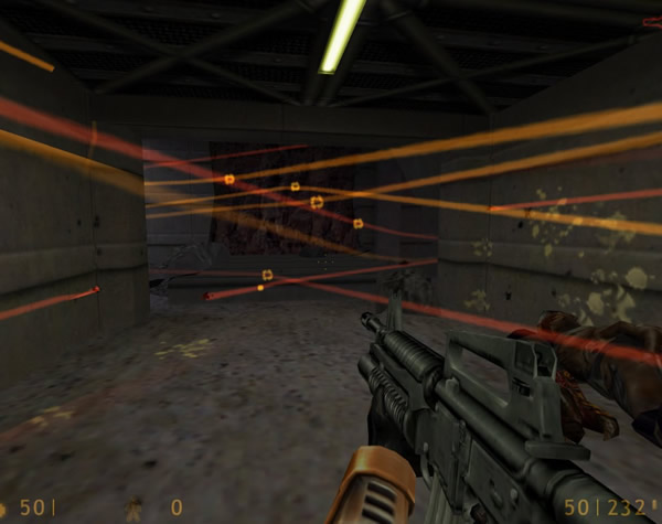 The player can easily close the gap between Freeman and the Vortigaunts by ducking into any of the several niches that line the hallway. This is where the deception comes in. After the first two Vortigaunts are dead, two more will teleport in. One of them will be in front of Freeman and present little or no challenge, but the other Vortigaunt is directly behind him.